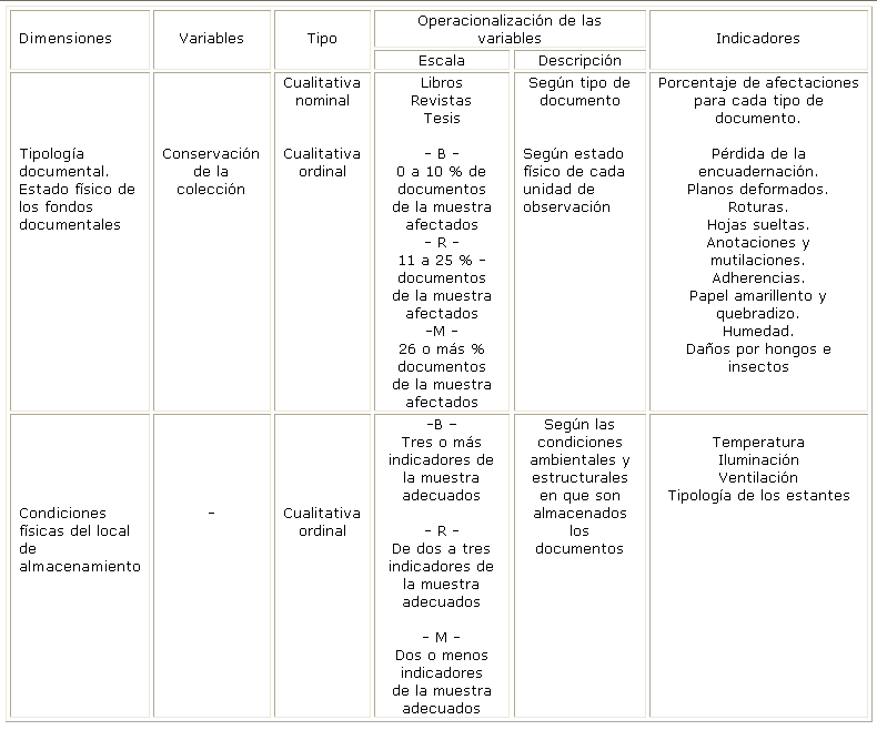 Para dar cumplimiento a la evaluación del estado de conservación y preservación de la colección se tuvo en cuenta la escala de valores que aparece en el cuadro.