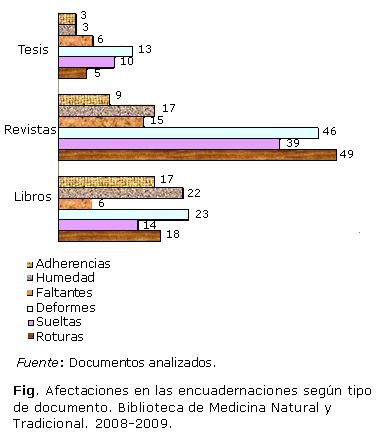 Las tesis son los documentos menos dañados (solo las encuadernaciones deformes), y están ubicadas en la escala de Regular. Este resultado responde a que las tesis con que cuenta el fondo son recientes, por lo que no han tenido un uso prolongado, además de que la mayoría de las deformidades encontradas son consecuencia de la mala calidad de la encuadernación y, fundamentalmente, de las inadecuadas condiciones de almacenamiento y manipulación (fig.).