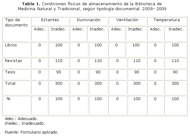 Del total de documentos que conforman la colección fueron analizados, 100 libros (22 %), 110 revistas (24 %) y 90 tesis (40 %), teniendo en cuenta las condiciones físicas de almacenamiento relativo a estantes, iluminación, ventilación y temperatura. A partir de los indicadores establecidos (tabla 1) se puede comprobar que los cuatro aspectos analizados están evaluados de Mal, ya que el 100 % de los documentos analizados no tienen las condiciones adecuadas de almacenamiento.
