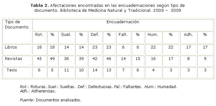 De los 100 libros analizados, 18 (18 %) presentaron encuadernaciones rotas; también se observaron 14 (14 %) con encuadernaciones despegadas o sueltas y 23 (23 %) con planos deformados; 6 (6 %) encuadernaciones faltantes; 22 (22 %) con humedad y 17 (17 %) encuadernaciones adheridas. En las revistas se encontraron 45 (49 %) rotas, 36 (39 %) sueltas, 42 (46 %) deformes, 14 (15 %) faltantes, 16 (17 %) húmedas y 8 (9 %) con adherencias. Las tesis fueron las menos dañadas: 6 (5 %) rotas, 11 (10 %) sueltas, 14 (13 %) deformes, 7 (6 %) faltantes, 4 (3 %) con humedad y 3 (3 %) adheridas (tabla 2).