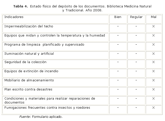 En la valoración del depósito de los documentos se analizó tanto el estado físico como los ambientales y los factores de riesgo que influyen en este (tabla 4). En esta tabla se resumen las deficiencias detectadas en el estado físico del local de depósito de la colección. Las amenazas y debilidades que enfrenta la institución y que inciden directamente en el deterioro progresivo de sus fondos documentales.